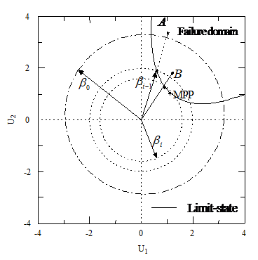 對所有滿足的樣本點,即落入第次迭代的超球外的失效樣本點,如4.1中的A、B點,分別求其概率密度函數,選取其中概率密度函數最大的樣本點,在其與坐標原點的連線方向上進行線性搜索,由于是內插搜索,因此一般經過23次搜索,即可確定該連線與極限狀態的近似交點,交點到原點的距離即為新的超球半徑