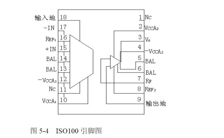 由于環境試驗箱的工作環境十分惡劣,因此輸入通道的各個環節中存在各種電磁干擾以及共模干擾等不良因素,會造成測量信號嚴重失真,系統不穩定等后果。特別是存在強電干擾時會直接影響系統的安全。為此,在輸入通道中常常采用信號隔離措施。常用的方法是采用隔離放大器。這是因為隔離放大器的線性和穩定性好,隔離電壓和共模抑制比高,應用電路簡單,頻帶較寬等。本設計中采用了ISO100光耦合隔離放大器保證前向通道的信號傳輸質量ISO100 是一種小型廉價的光耦合隔離放大器。其工作電源為±18V,隔離電壓2500V,輸入電流為±1mA,頻帶寬達60kHz,為18 引腳DIP 組件。引腳圖如圖5-4 所示: